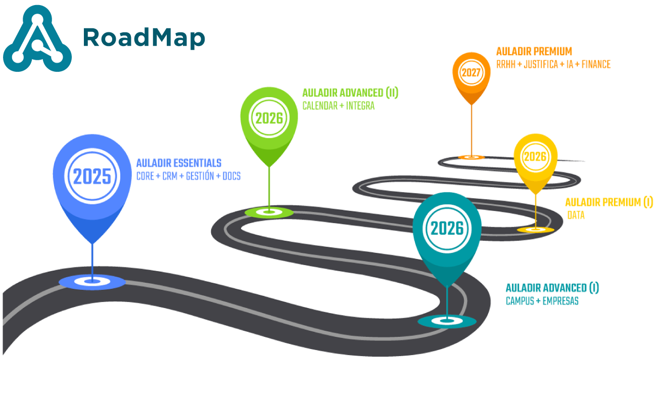 El Roadmap de Auladir representa la hoja de ruta del ecosistema, mostrando el estado de desarrollo de cada uno de sus módulos. Algunos se encuentran en fase de análisis y planificación, donde se definen sus objetivos y funcionalidades; otros avanzan en la etapa de desarrollo y pruebas, centrados en la implementación y validación técnica. También existen módulos parcialmente en producción, que ya están operativos mientras continúan ampliándose, y aquellos en producción y mejora continua, plenamente funcionales y en constante evolución para optimizar el rendimiento y la experiencia del usuario.